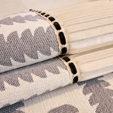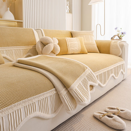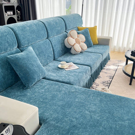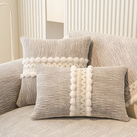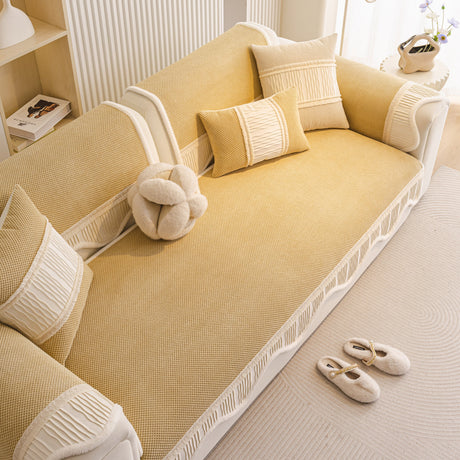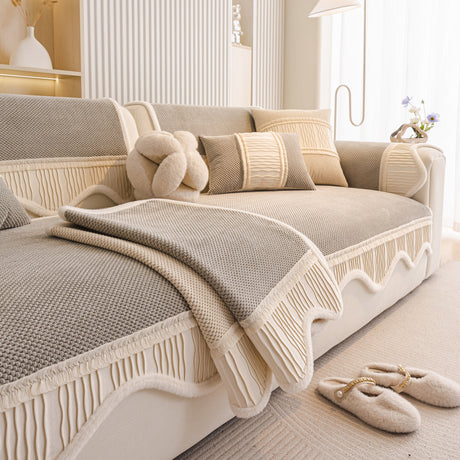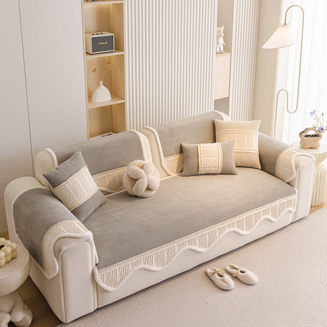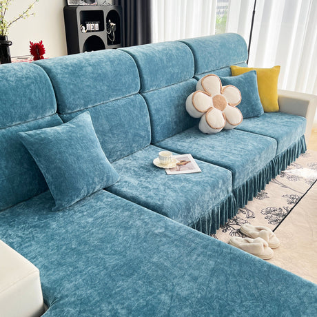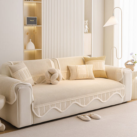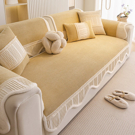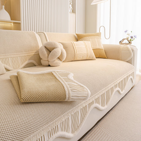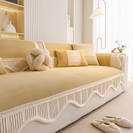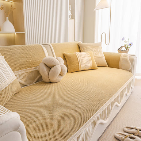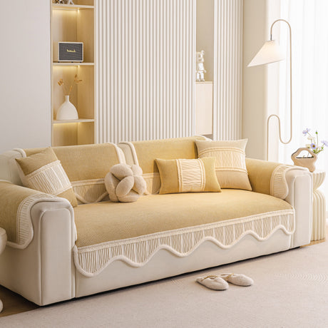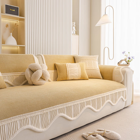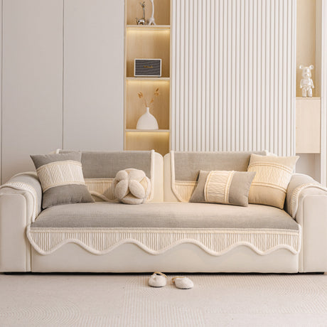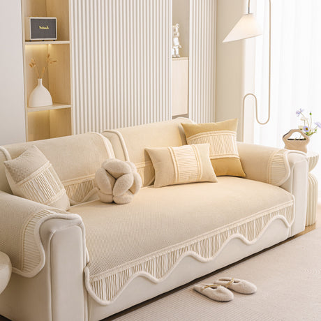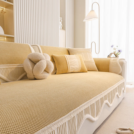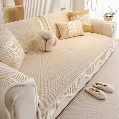 Soft Chenille Sectional Sofa Cover with Pom Pom Trim – Non-Slip Couch Protector
