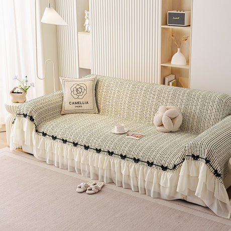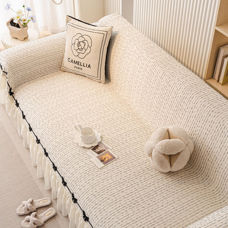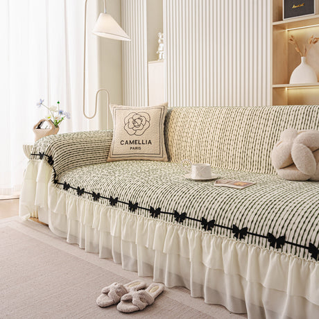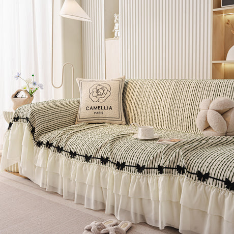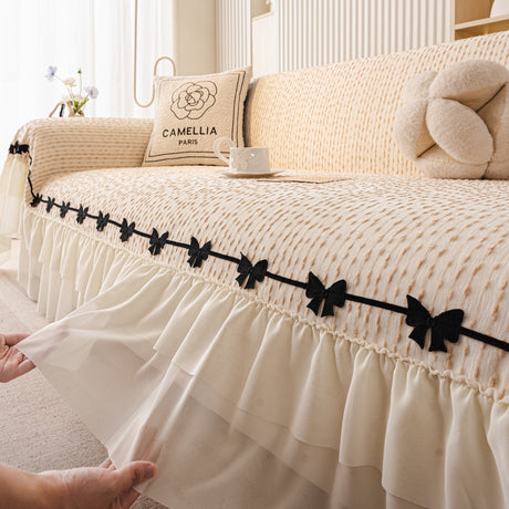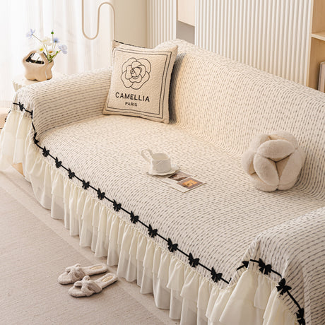Ruffled Sofa Cover with Bowknot Decor, French Country Style Skirted Couch Slipcover