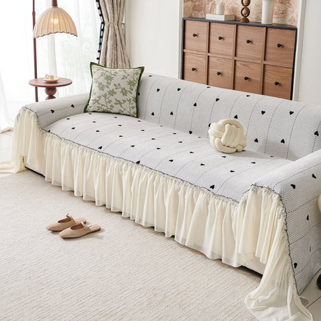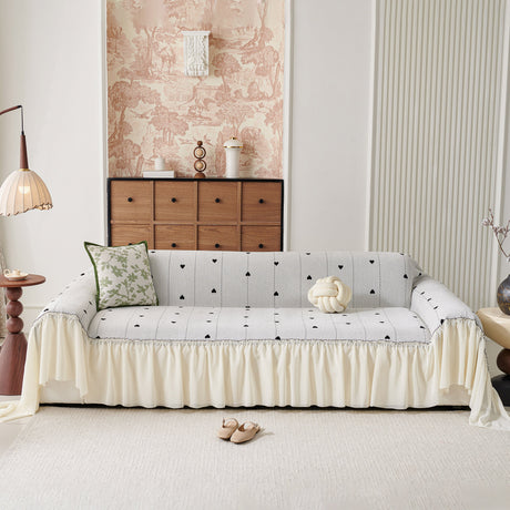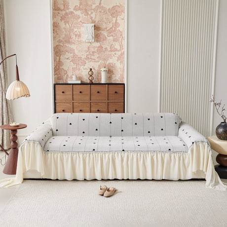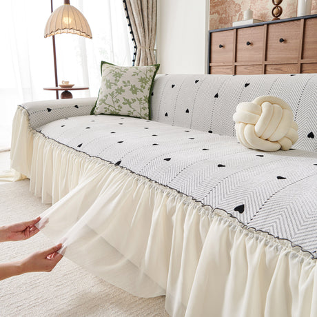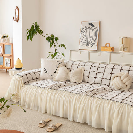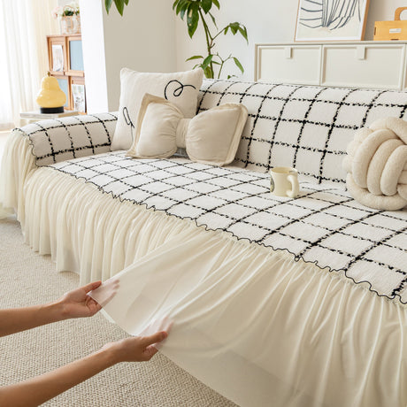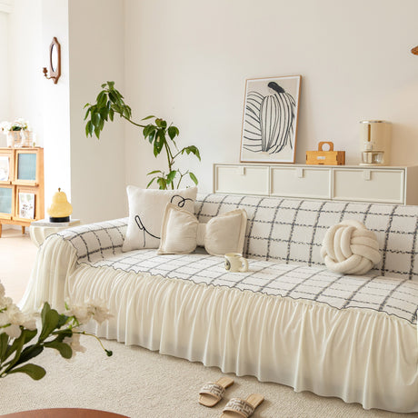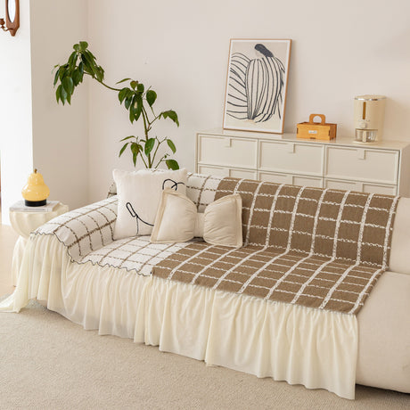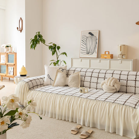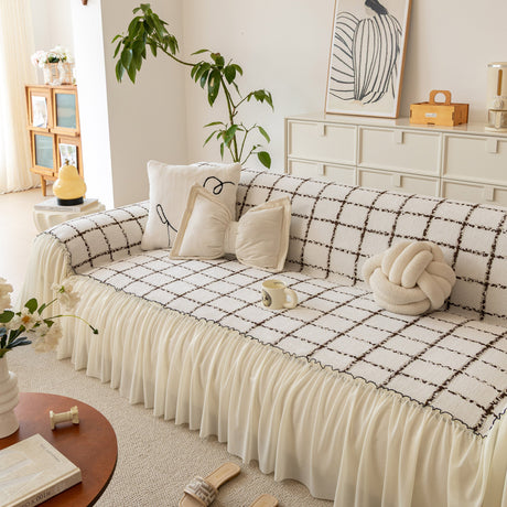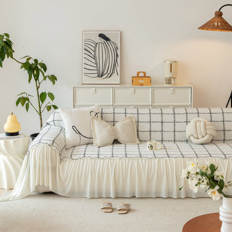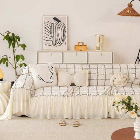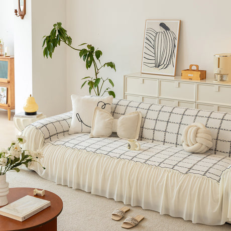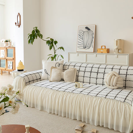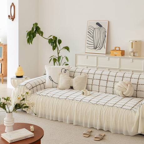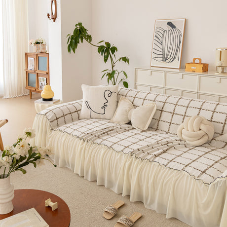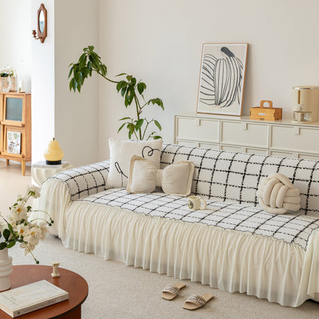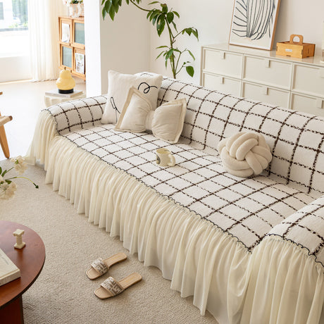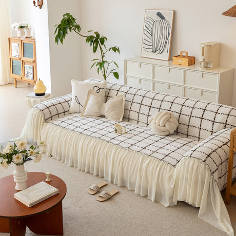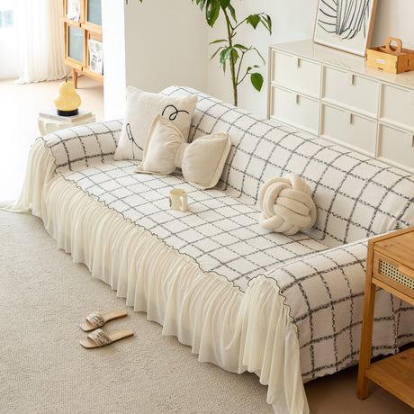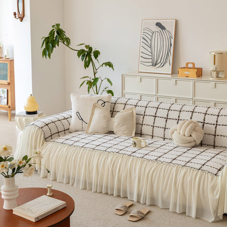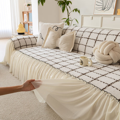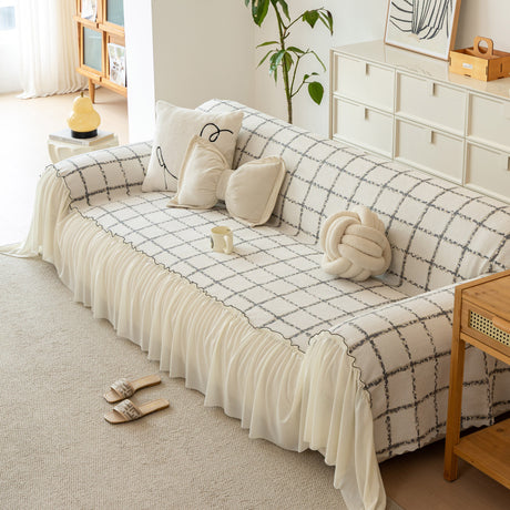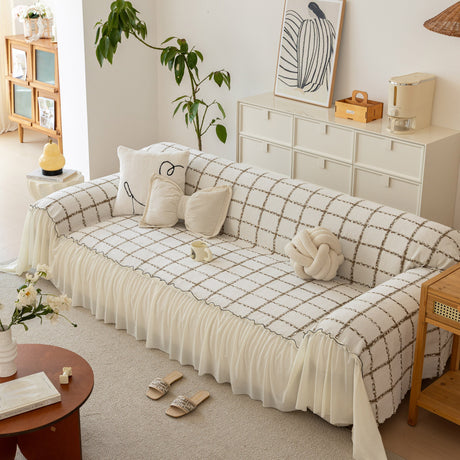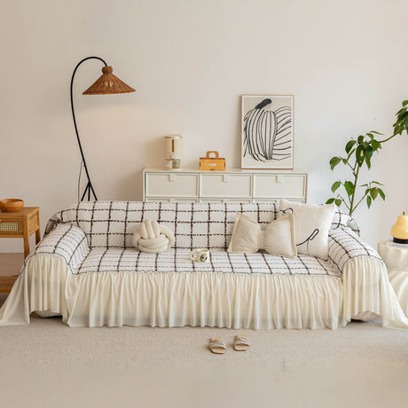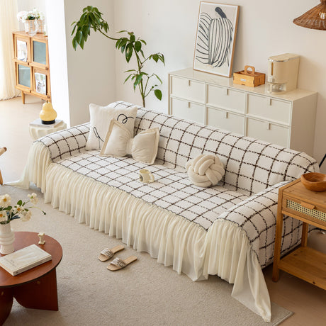 Grid Sofa Cover with Ruffle Skirt – Soft, Decorative, Full-Cover Couch Protector