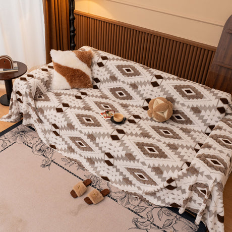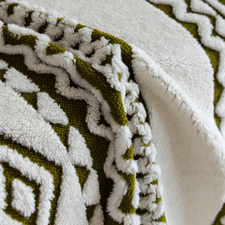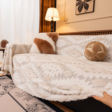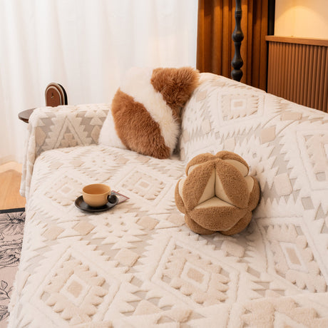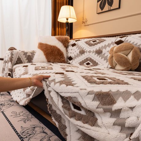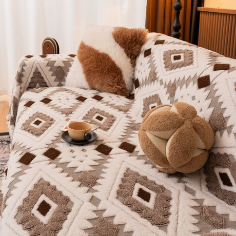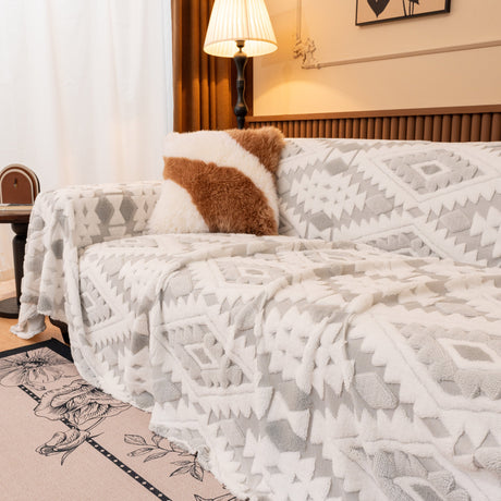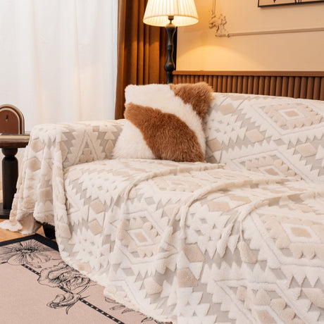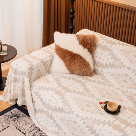 Bohemian Tufted Sofa Cover, Soft Sherpa Fleece Throw Blanket with 3D Aztec Geometric