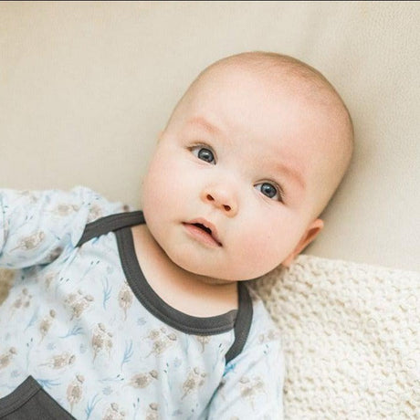 Sale price $24.00 Regular price $45.00Unit price /Unavailable Shawl-Neck Romper - Curly Sheep on Baby Blue 100% Pima Cotton by Feather Baby