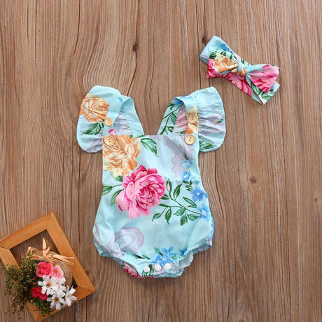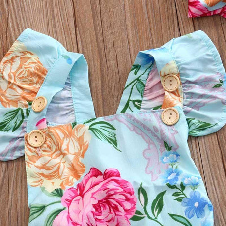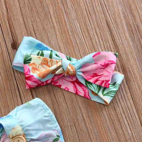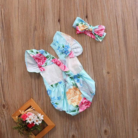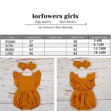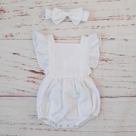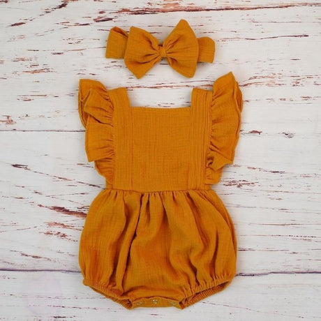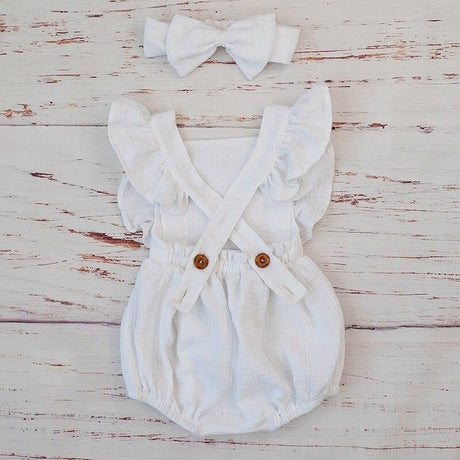 Cotton Baby Girl Double Ruffle Romper Jumpsuit with Headband Playsuit For Newborn With Bow