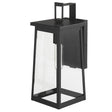 Add some contemporary style and design to your outdoor space with the Black Contempo Elongated Outdoor Wall Light. Sleek lines, a long tapered body, clear glass, and an overall sharp design give this wall mount light a unique look. The black coloration of the frame combined with the crispness of the glass, adds to this fixture's beauty. 15" x 6" x 7".