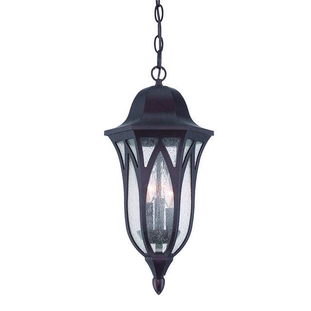 With this Matte Black Geometric Glass Hanging Light you can elevate the look of your exterior walls in no time. The hanging chain has a matte black finish and is attached to the top of the main body of the light. The top of the light has a geometric dome shape which extends down into a curved geometric frame. The bottom has a narrow ornament. Inside the frame there is a slightly frosted glass which adds character to the overall look of the light. Use this light on its own or in pairs around the outdoor spaces of your home. 19.5" H x 9" W x 9" D