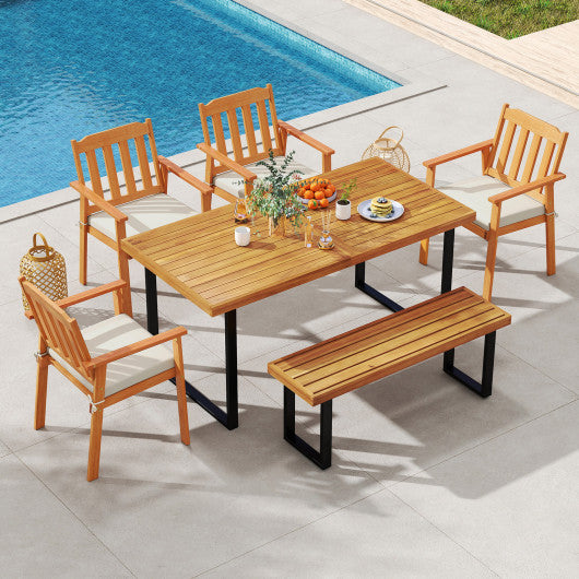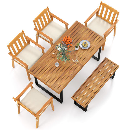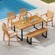6 Pieces Patio Dining Table Set 63” Rectangle Table with 4 Acacia Wood Armchairs and Backless Bench