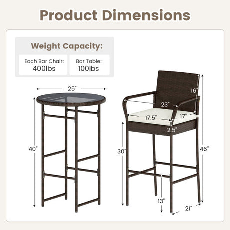 3 Piece Patio Bar Set Outdoor Wicker Bar Height Round Table and Armchairs-White