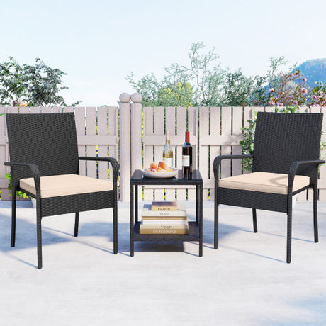 3 Piece Patio Furniture Set with Seat Cushions and Tempered Glass Tabletop-Beige