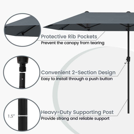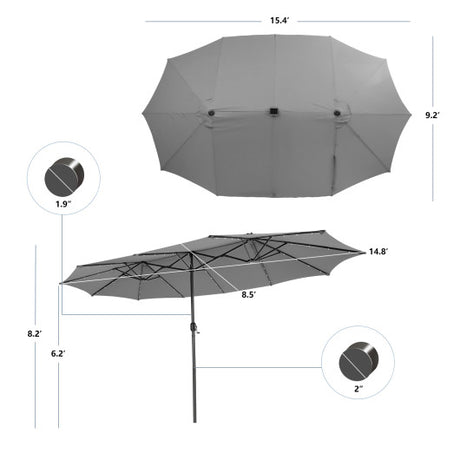 15 Feet Twin Patio Umbrella with 48 Solar LED Lights-Gray