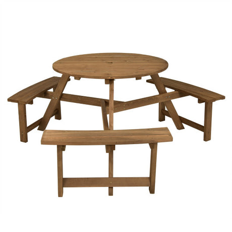 6-person Round Wooden Picnic Table with Umbrella Hole and 3 Built-in Benches-Dark Brown