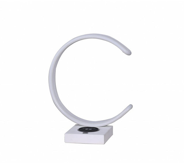 Bring of level of cool style to your space with this good looking 14" white metal led with USB wireless charger table lamp. The base of this lamp is made of metal finished in a white tone in a unique C shape. The white coloring of this lamp adds a delightfully neutral tone to your home and matches with most any decor. This minimalist and contemporary lamp features a built in USB port, touch button dimmer control and a wireless charger all included. 13.5" H x 6.25" W x 10.5" D