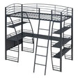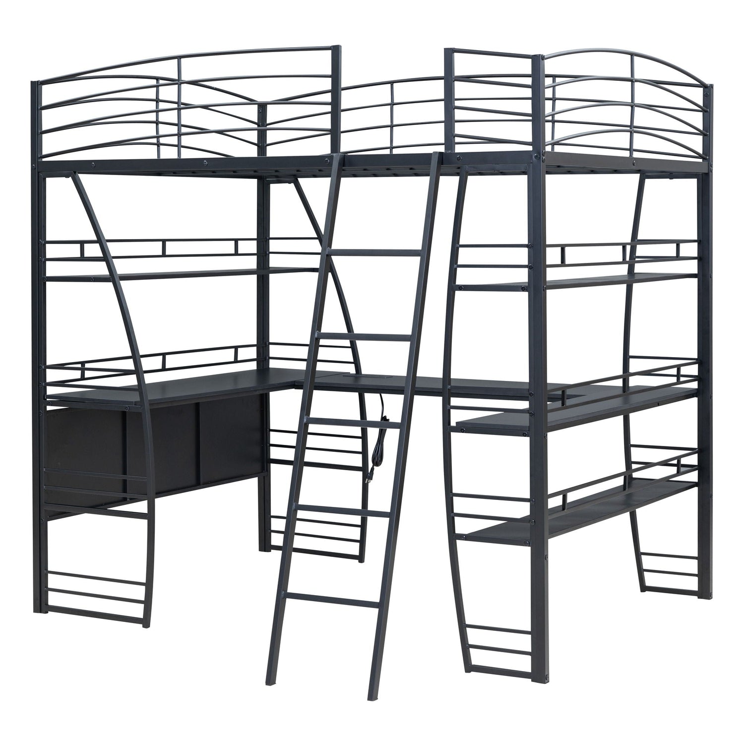 Full Size Loft Bed With 4 Layers Of Shelves And L-Shaped Desk, Stylish Frame With A Set Of Sockets, USB Ports And Wireless Charging - Black