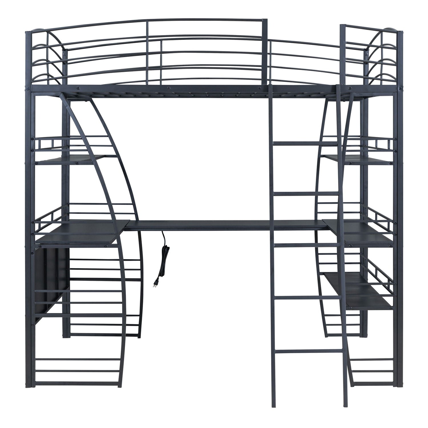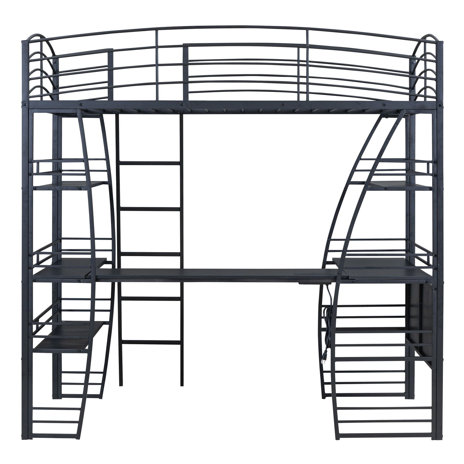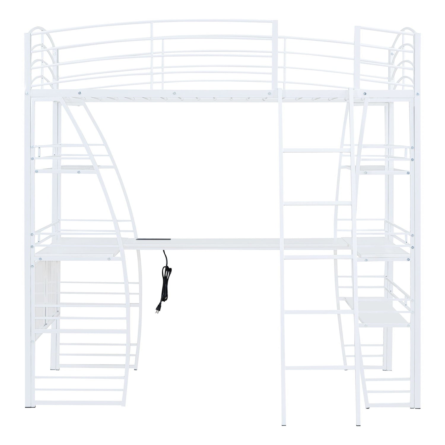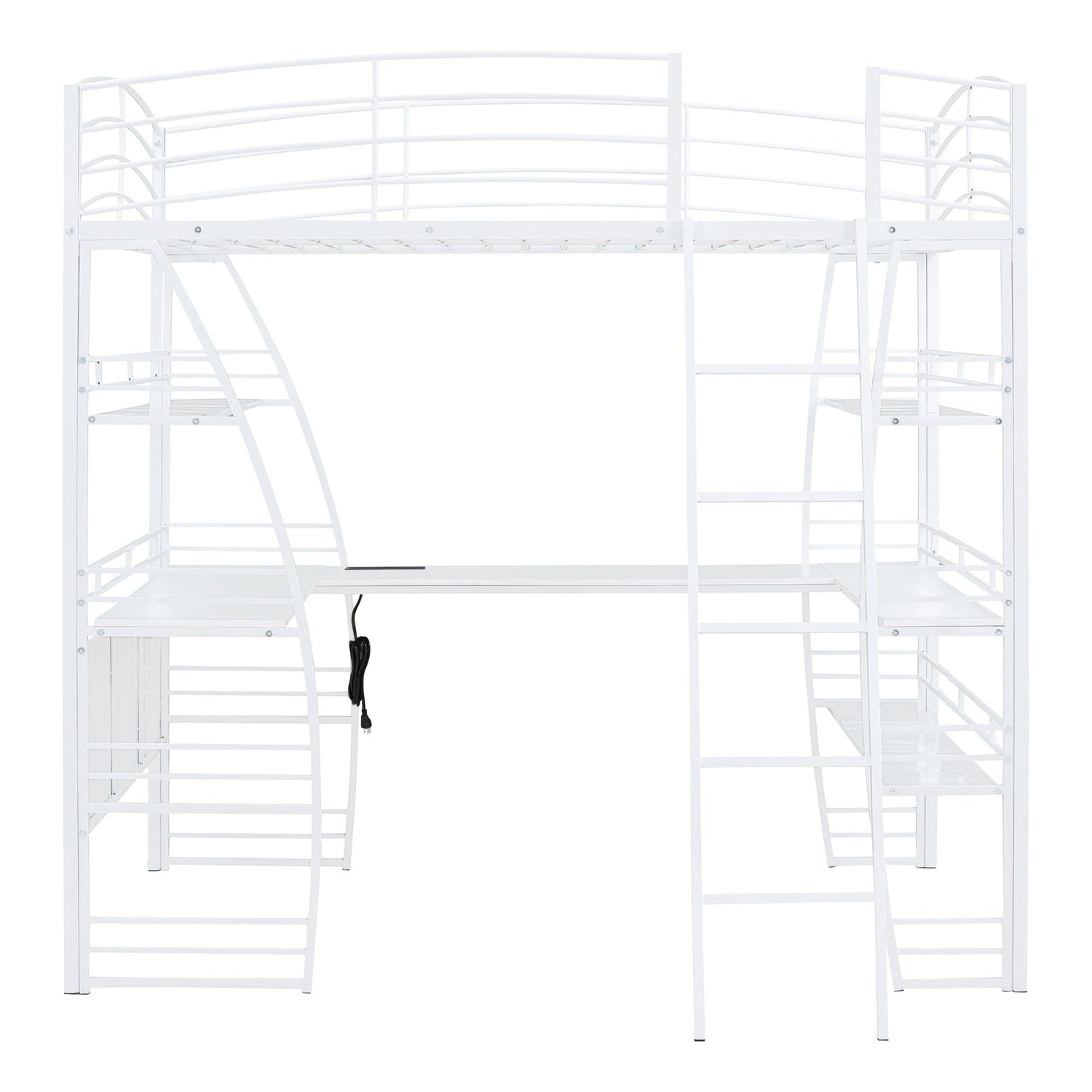 Crafted from metal with a clean painted finish, this metal loft bed strikes a clean-lined silhouette with curved slatted guardrails. This bold and imaginative design easily captures attention and complements your room decor. The four-layer open shelves offer ample space to display whatever you want, including lamps, books, and toys. For your convenience, a set of sockets, USB ports, and wireless charging is equipped on the desk, saving you the hassle of charging your phone and tablet while you work or read. Equipped with a large L-shaped desk, this bed provides a comfortable place to work, read, and enjoy yourself. I am sure that this imaginative loft bed can create your little wonderful world.