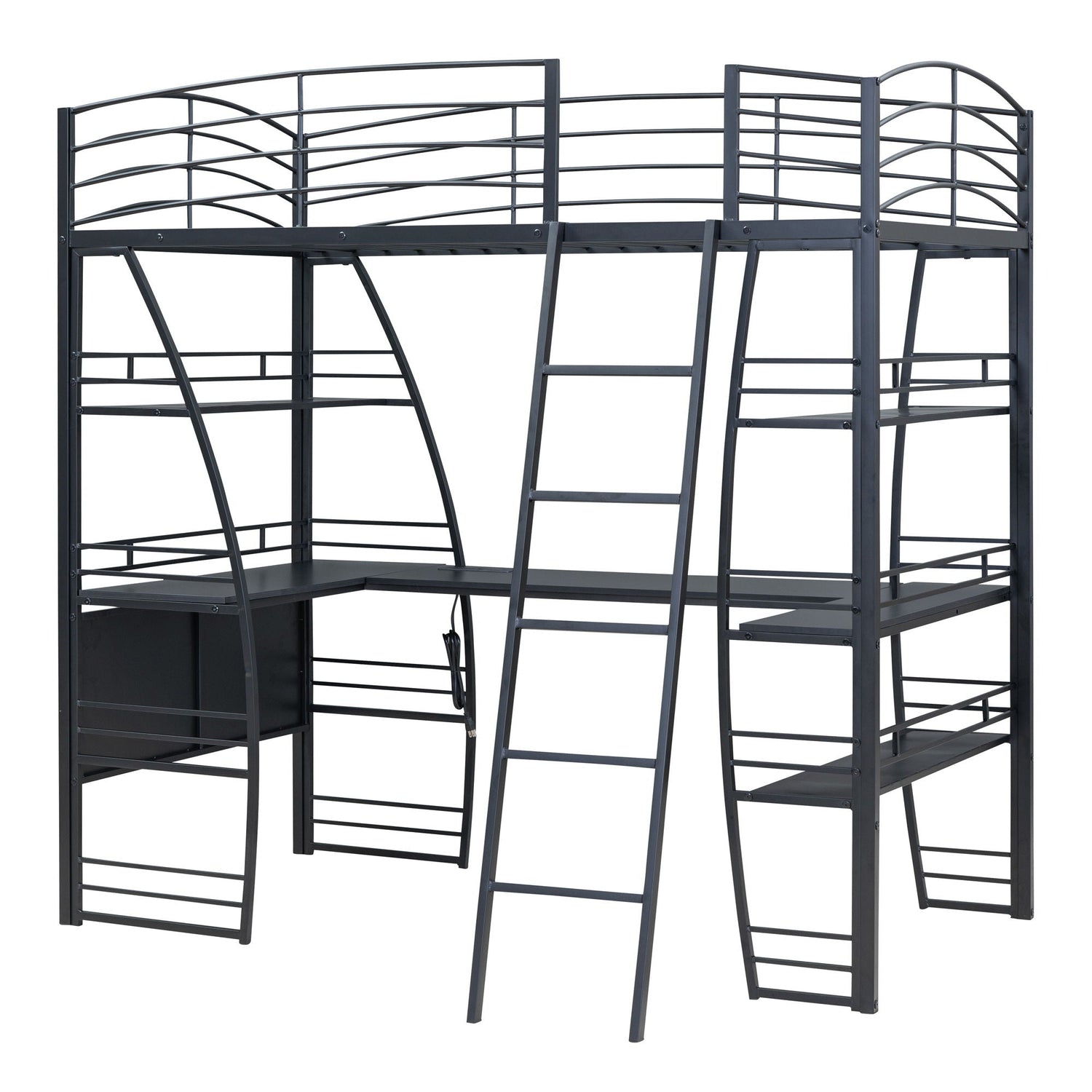 Loft Bed With 4 Layers Of Shelves And L-Shaped Desk, Stylish Metal Frame Bed With A Set Of Sockets, USB Ports And And Wireless Charging by Couch.com - Black / Twin is backordered and will ship as soon as it is back in stock.