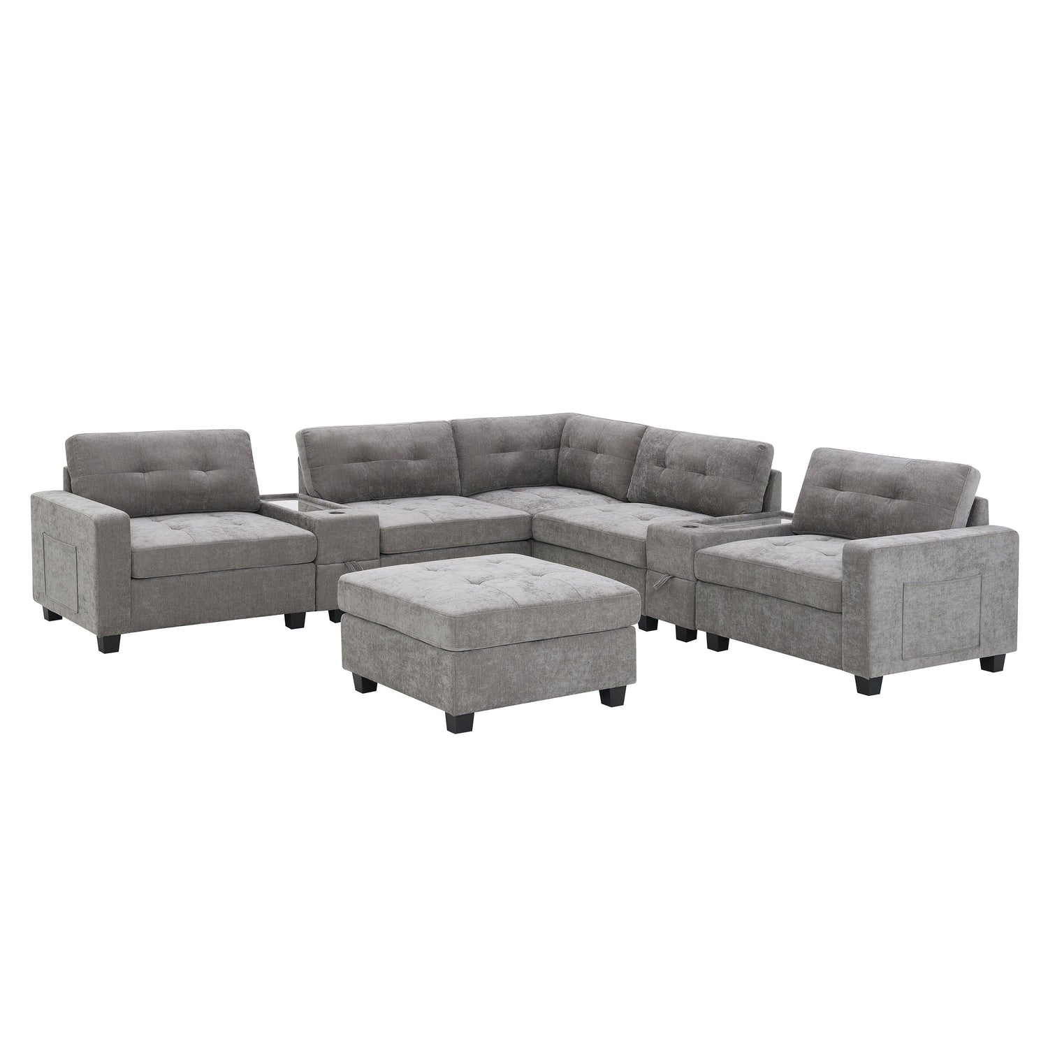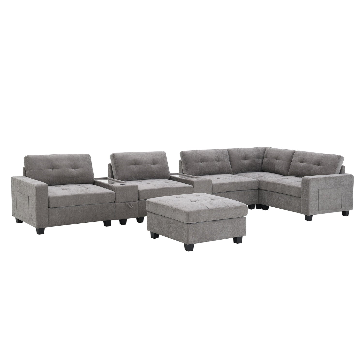 Sectional With Acrylic Table Top U Shaped Couch Set With 2 Consoles USB Charger, Storage Drawers And Pockets Movable Ottoman Tufted Sofa - Gray