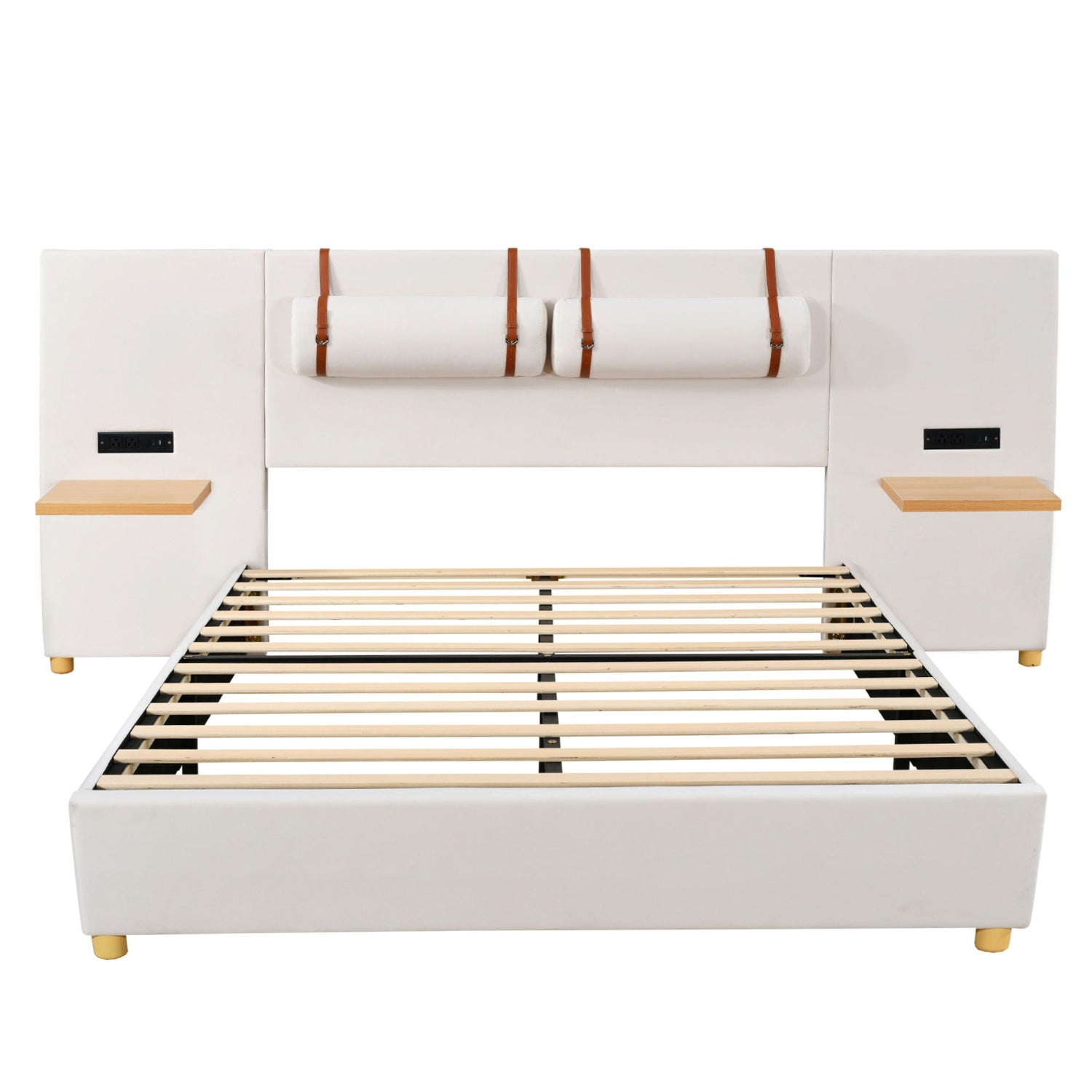 Upholstered Platform Bed, 2 Outlets And USB Charging Ports On Both Sides, 2 Bedside Pillows, Storage Shelves by Couch.com - Beige / Queen is backordered and will ship as soon as it is back in stock.