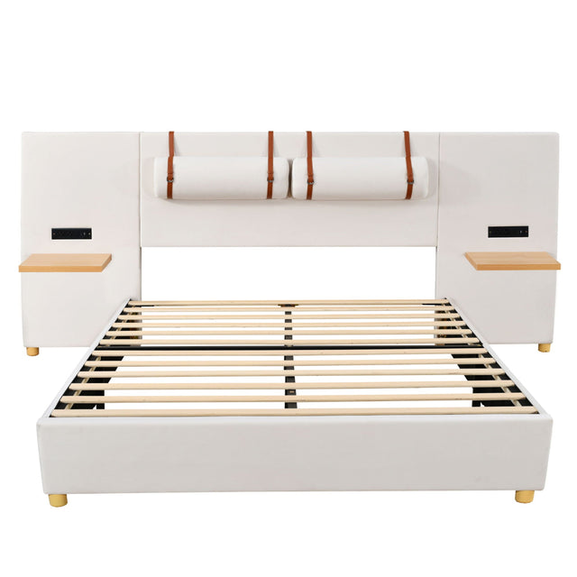 Queen Size Upholstered Platform Bed, 2 Outlets And USB Charging Ports On Both Sides, 2 Bedside Pillows, Storage Shelves - Beige