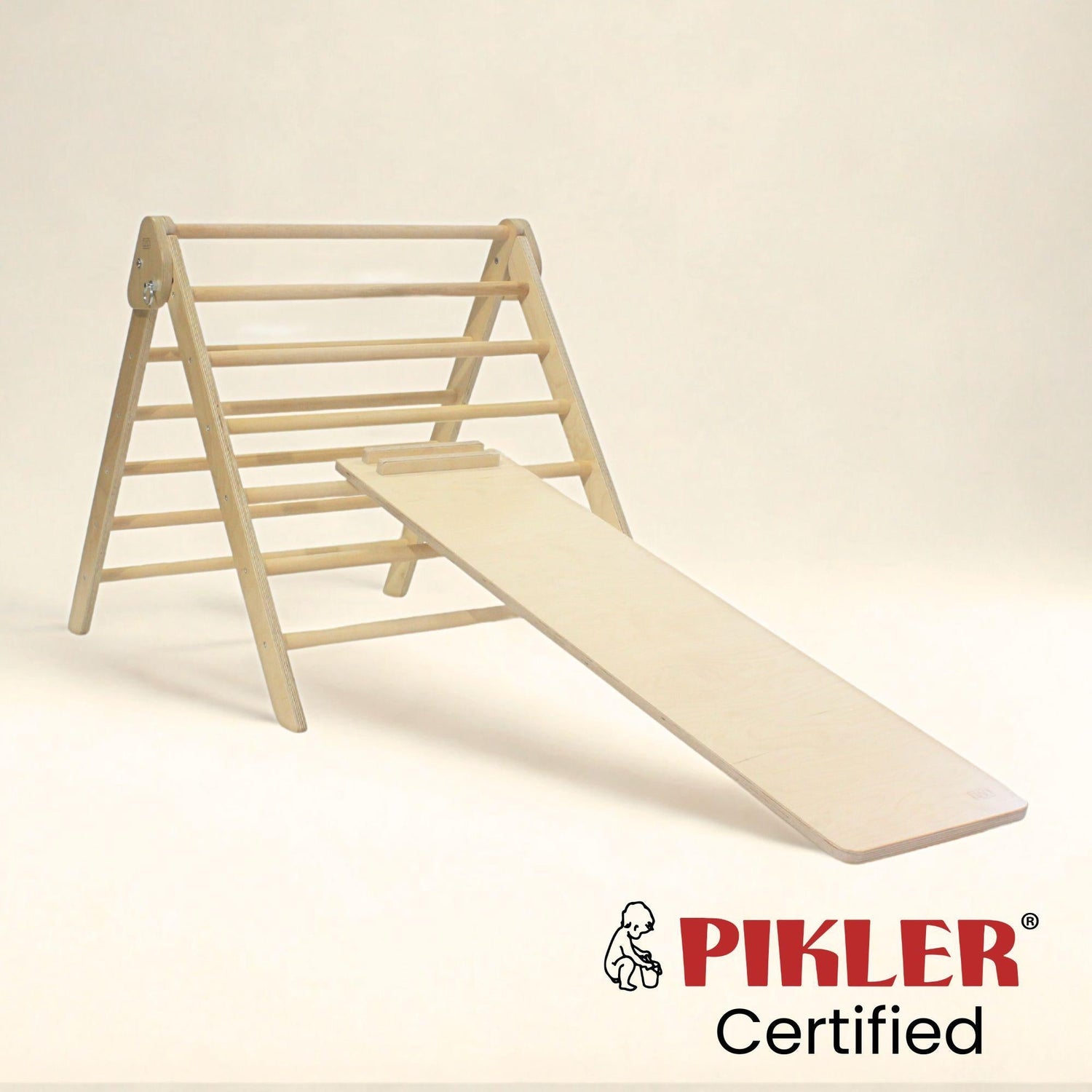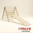 The Pikler Triangle is a must-have for your child's gross motor development. Certified by the Pikler Organization and designed based on Dr. Emmi Pikler's principles, this American-made climbing triangle enhances balance and gross motor skills. Watch as your little one learns to stand, climb, and collaborate with others on this versatile and imaginative play structure. Safety is a priority with its sturdy construction and automatic lock feature. Fold it flat for easy storage.  Complete the set with the Reversible Climbing Ramp.