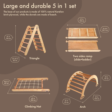 5in1 Montessori Climbing Set: Triangle Ladder, Climbing Arch, Slide, Net & Cushion – Chocolate