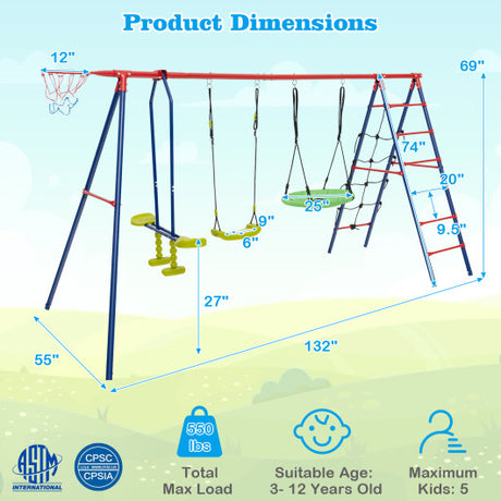 550 LBS 6-in-1 Patio Kids Swing Set with Climbing Net and Ladder-Red
