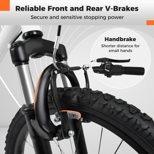 Dual Braking System: The mountain bike is fitted with reliable front and rear V-brakes which offer secure and sensitive stopping power allowing for quick and efficient stopping. In addition the handbrake design with a shorter distance accessible for smaller hands.