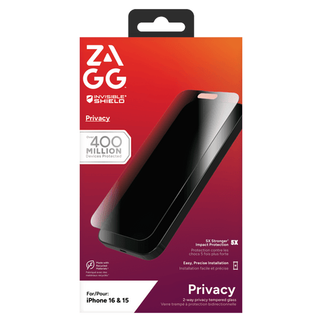 Regular price $59.99Unit price /Unavailable ZAGG Invisible Shield Glass Elite Privacy Screen Protector for Apple iPhone 16 / iPhone 15 by ZAGG