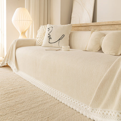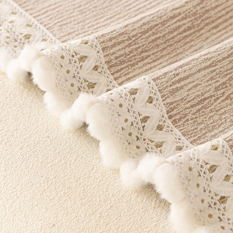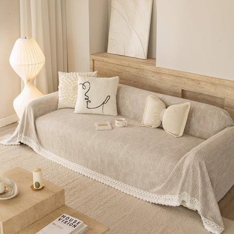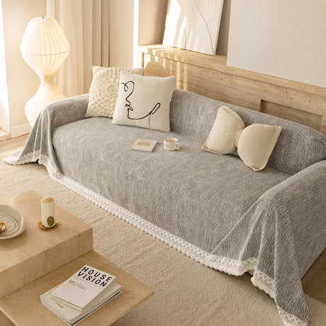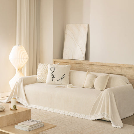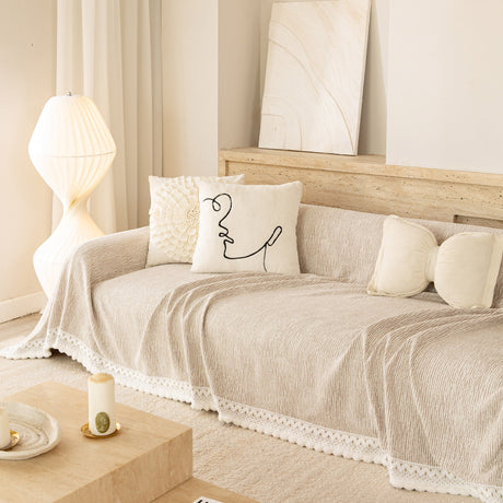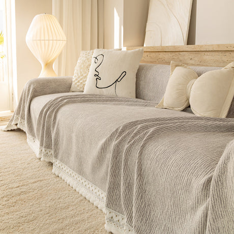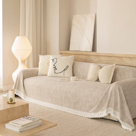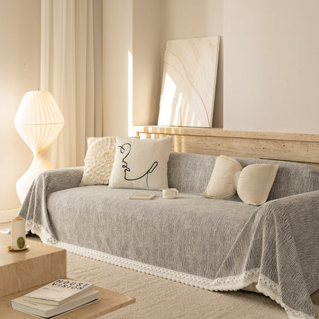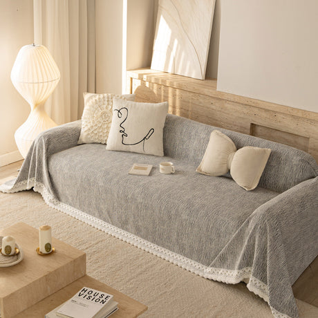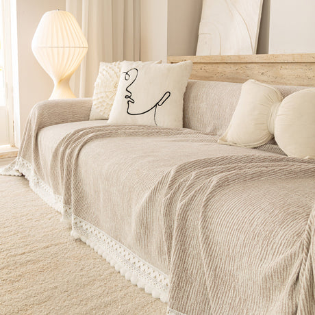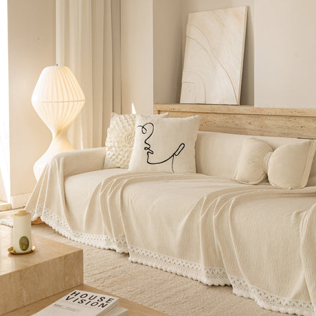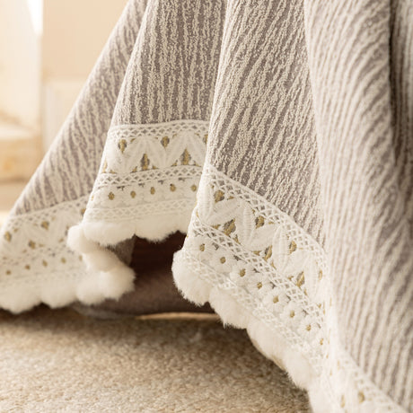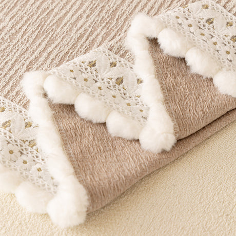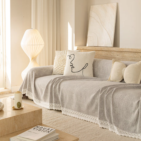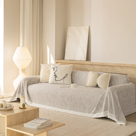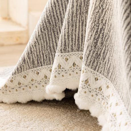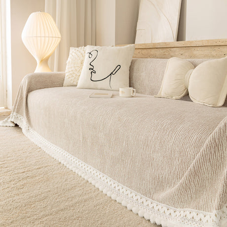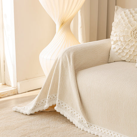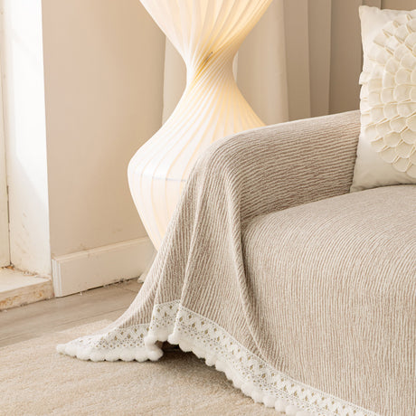 Sofa Cover Throw with Lace Trim & Pom-Pom Fringe, Decorative Couch Cover Blanket
