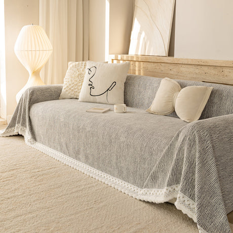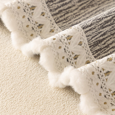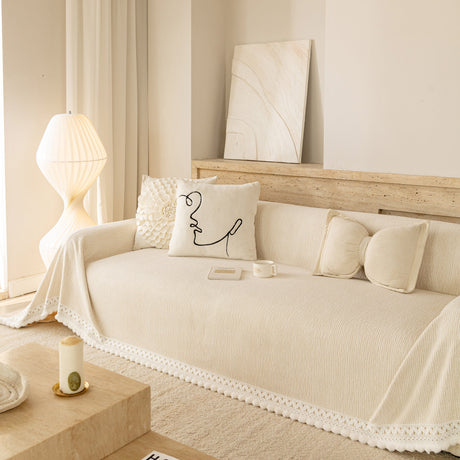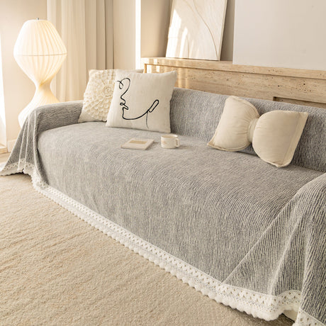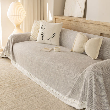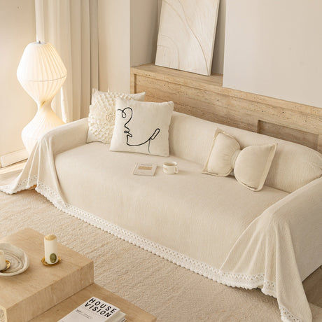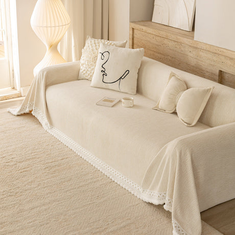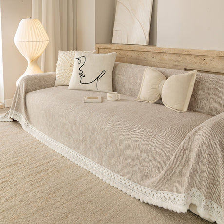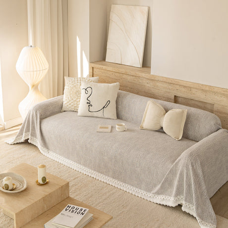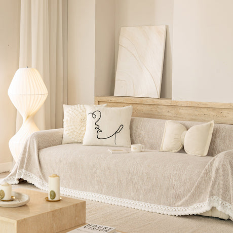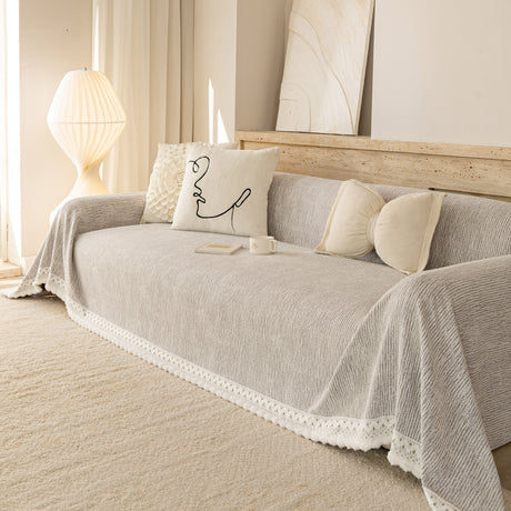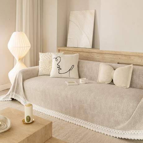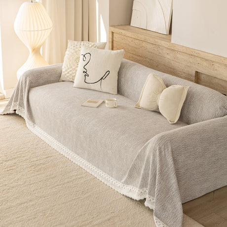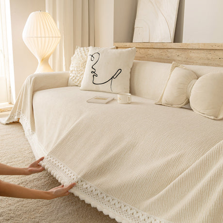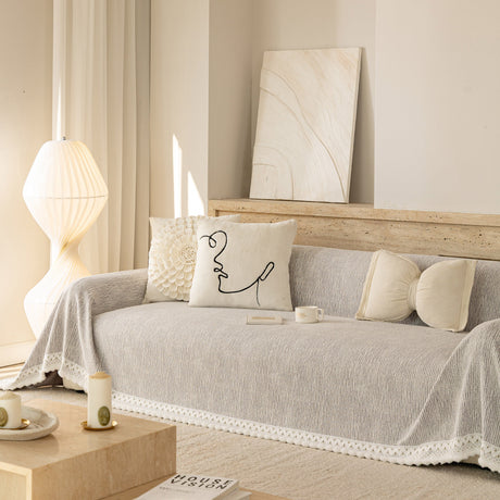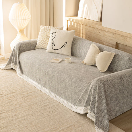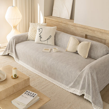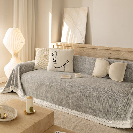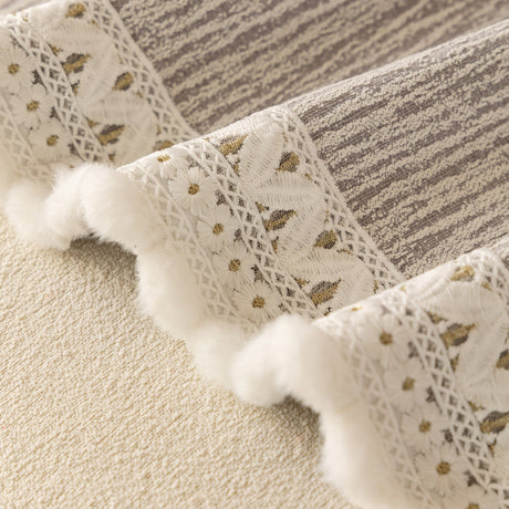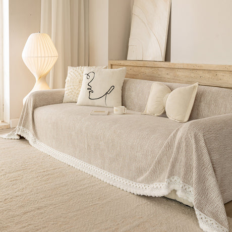 Sofa Cover Throw with Lace Trim & Pom-Pom Fringe, Decorative Couch Cover Blanket