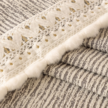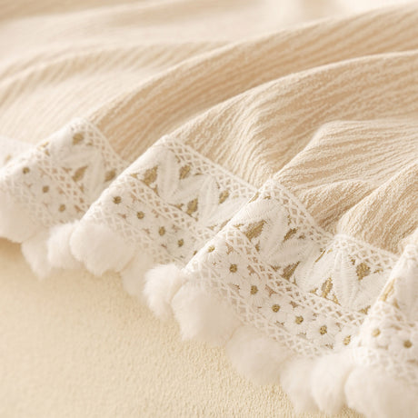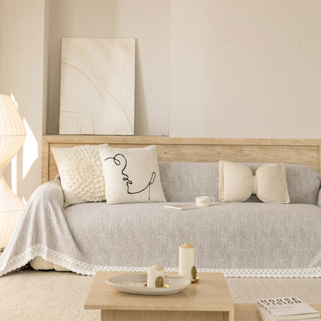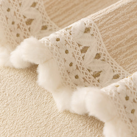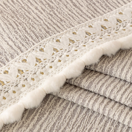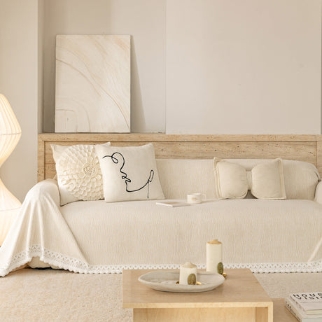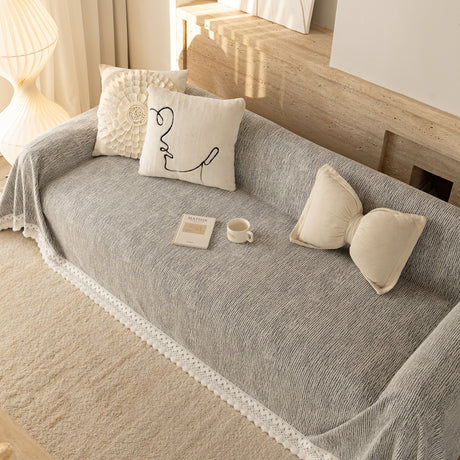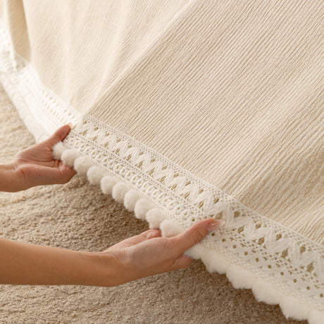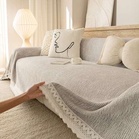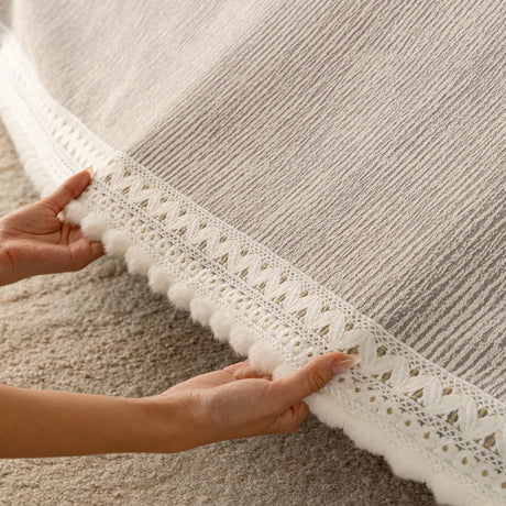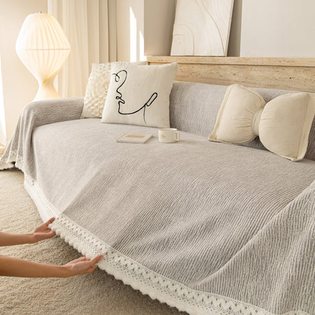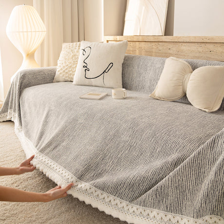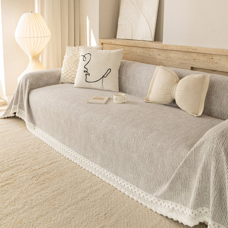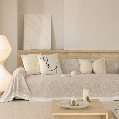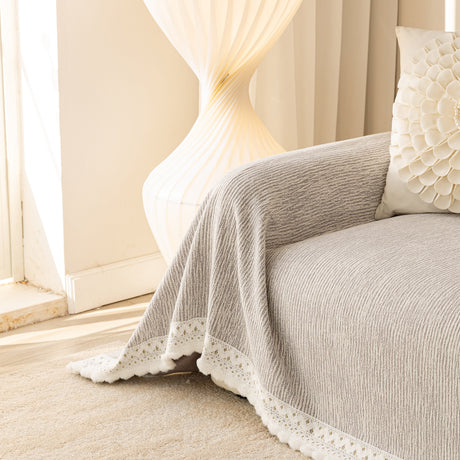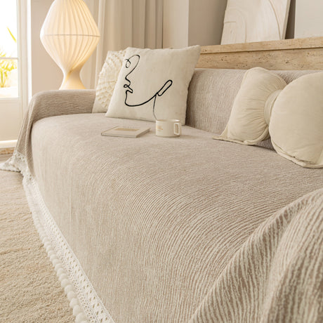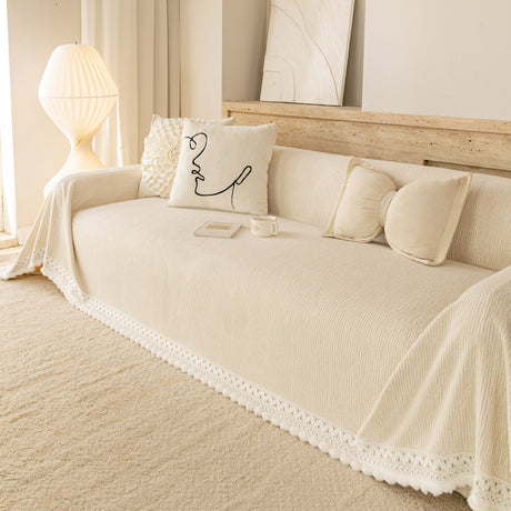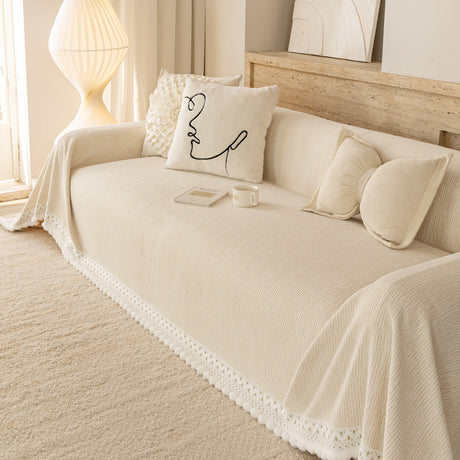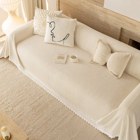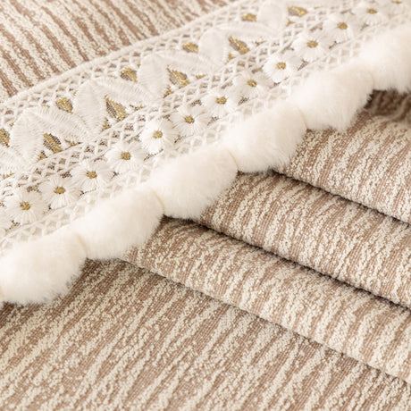 Sofa Cover Throw with Lace Trim & Pom-Pom Fringe, Decorative Couch Cover Blanket