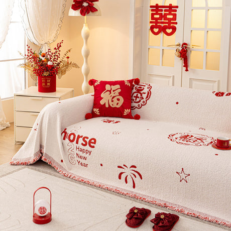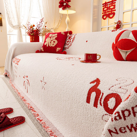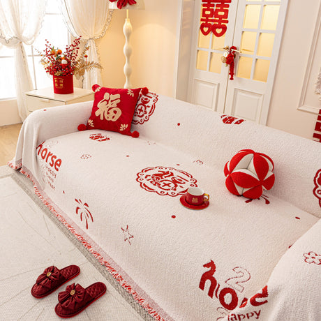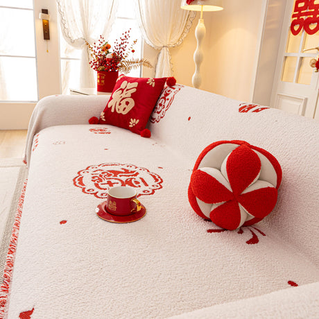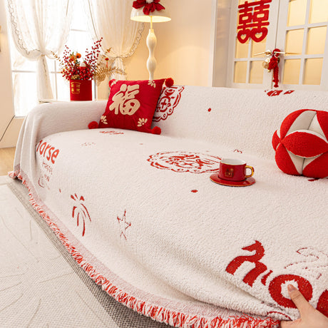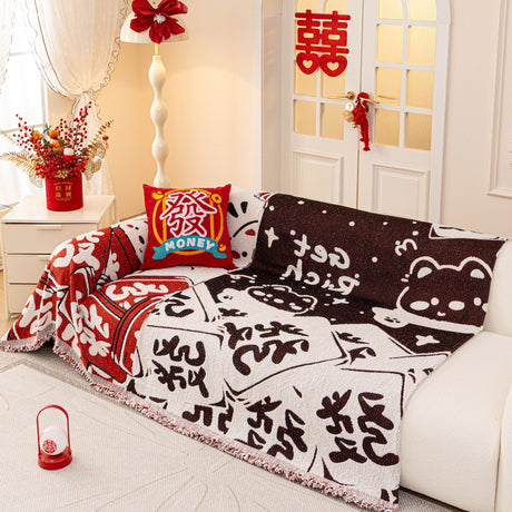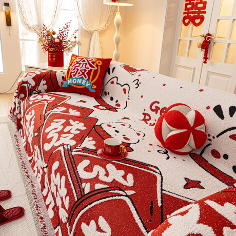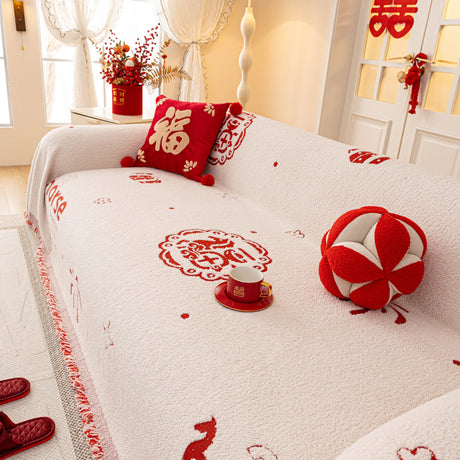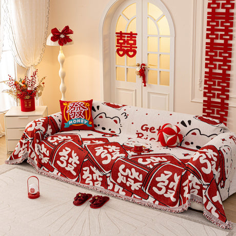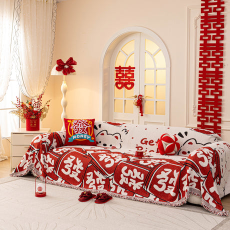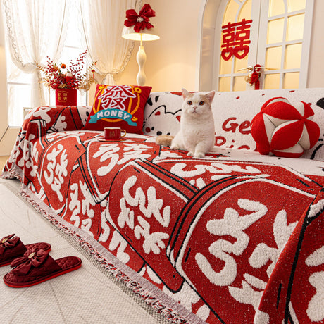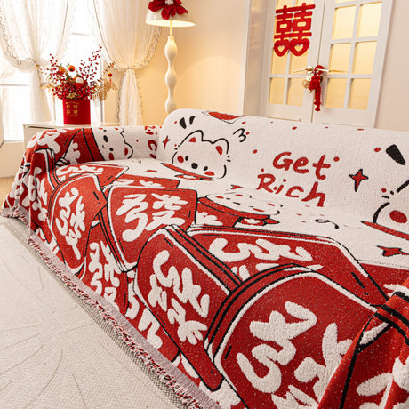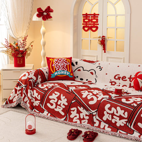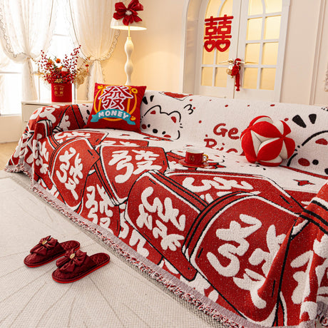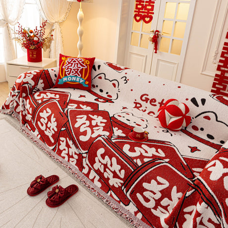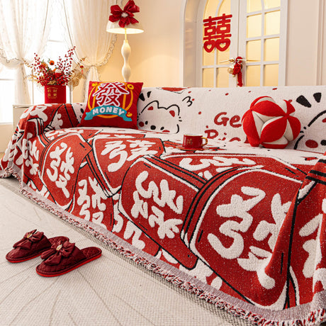 Chinese New Year Sofa Throw Cover Blanket, Decor Festive Red Fu Pattern Couch Cover