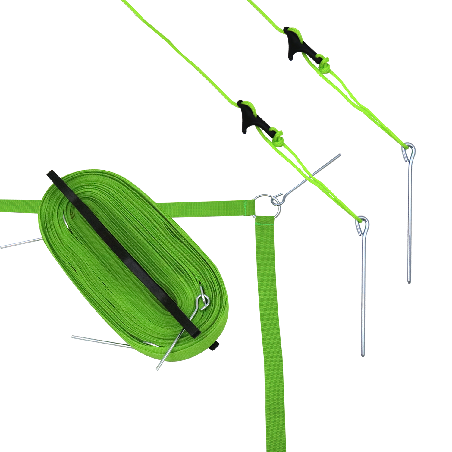• Mark the court with an over 1 3/16” wide high-visibility boundary premeasured to 30’ x 60’ made of green nylon webbing. A double stitched red line marks center court. Boundary line stores easily on plastic spool.