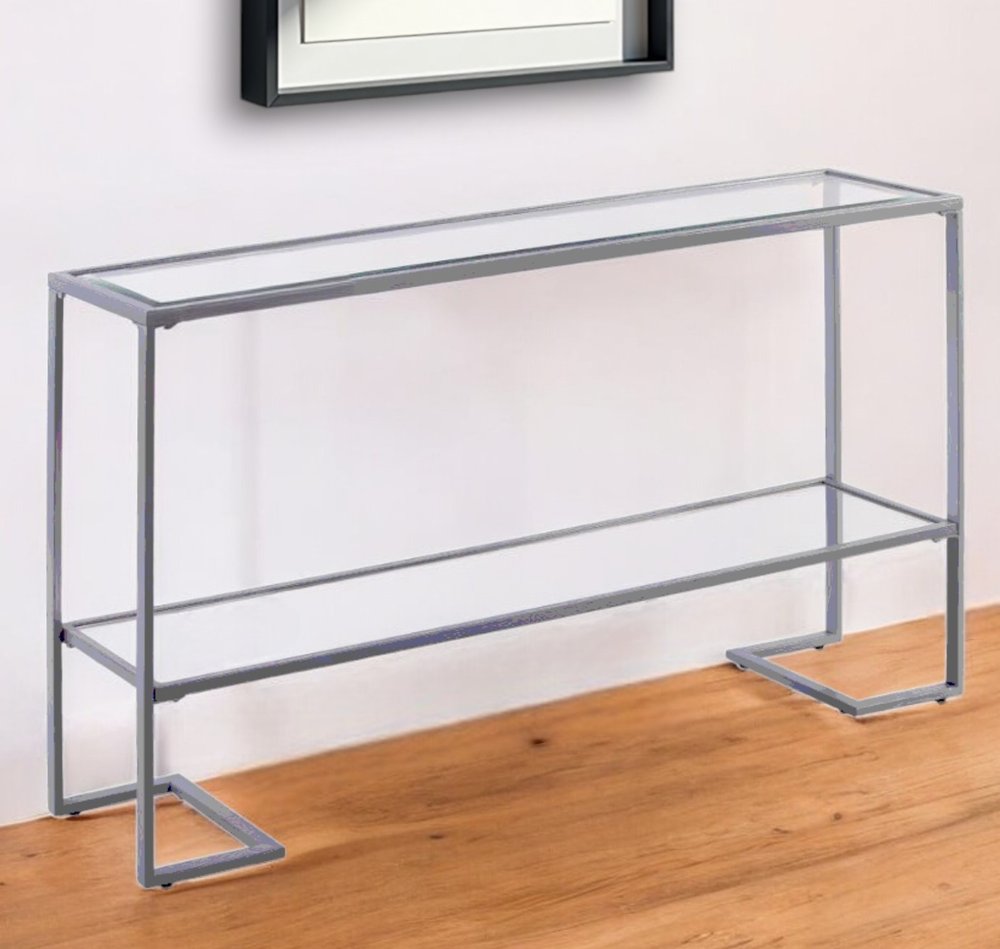 Don't settle for a boring entryway, upgrade your home with our 52-inch clear and silver glass sled console table with shelves today. This versatile table is a classic rectangular shape, which will easily fit into most any space in your home. The clear glass top of this console table is a stunning and timeless choice that can transform any room into a visually captivating showcase. Versatile in use, console tables can be used for a variety of purposes in a variety of rooms and settings. 29-inch H x 52-inch W x 12-inch D