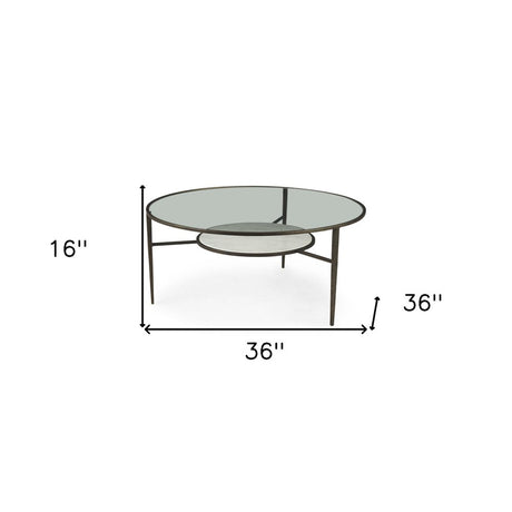 36" Clear and Bronze Glass and Metal Round Coffee Table With Shelf