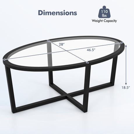 Glass Coffee Table Oval Living Room Table with Cross Base and Acacia Wood Legs-Black