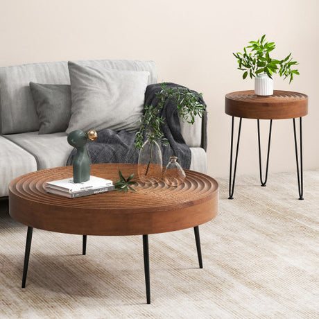 Set of 2 Boho Round Coffee Table with Solid Pine Wood Top and Metal Legs-Brown