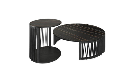 Set of Two Black Faux Marble And Solid Wood Round Abstract Nested Coffee Tables