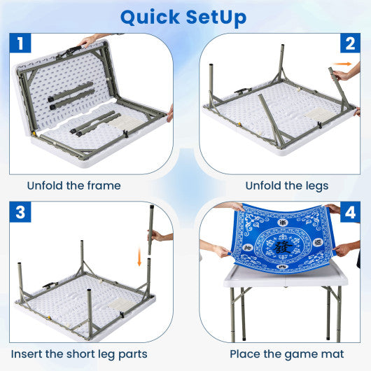 ● Quick Set Up: This portable mahjong table is easy to set up. Just unfold the frame and legs and insert the short leg parts and finally place the game mat and you're ready to play. The overall dimensions are 35" x 35" x 29" (L x W x H).