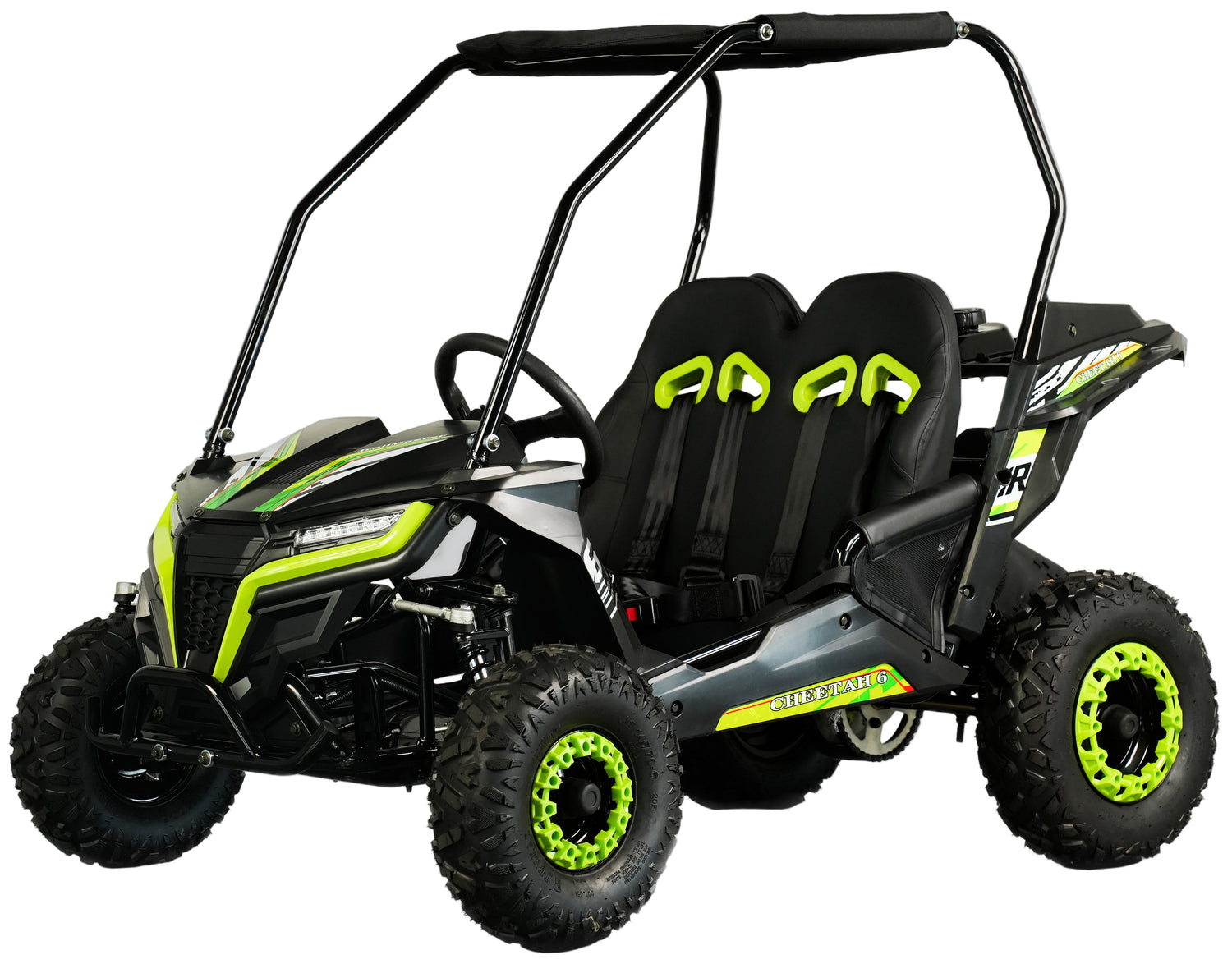 The Cheetah 6 boasts a 163cc, 5.5 HP horizontal OHV Engine and a torque converter CVT transmission, enabling a smooth takeoff. It can achieve a top speed of up to 24 MPH. The seat is adjustable, with a pedal-to-seat back range of 28” to 32”. For ease of starting in cold temperatures, it features a manual choke. Safety is enhanced with a pull cord kill switch. It also comes with an automatic CVT with reverse, hydraulic disc brake, 4-point safety seat belts, parking brake, fenders, a canopy top, and a cargo rack. The striking body panels and LED headlight package make the Cheetah 6 an impressive vehicle.