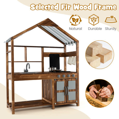 Kid's Mud Kitchen Outdoor Solid Wood Mud Kitchen with Canopy-Natural