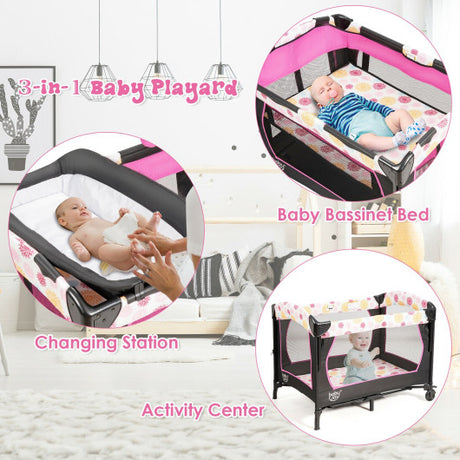 3-in-1 Convertible Portable Baby Playard with Music Box and Wheel and Brakes-Pink