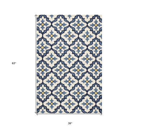 2' X 3' Ivory and Blue Moroccan Handmade Indoor Outdoor Area Rug