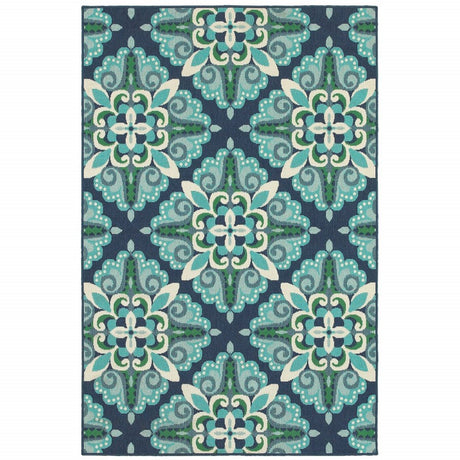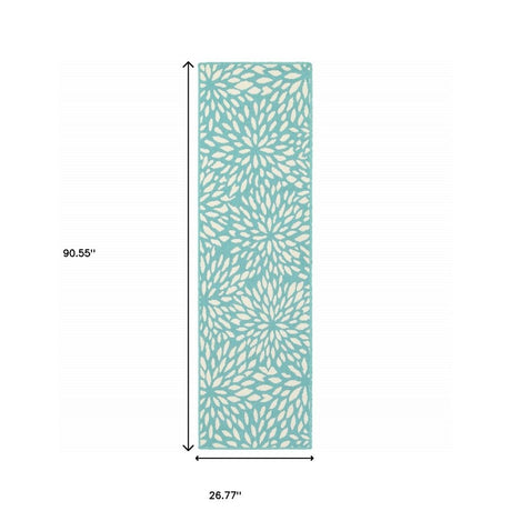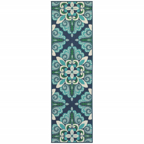 2' X 8' Blue and Ivory Floral Stain Resistant Indoor Outdoor Area Rug