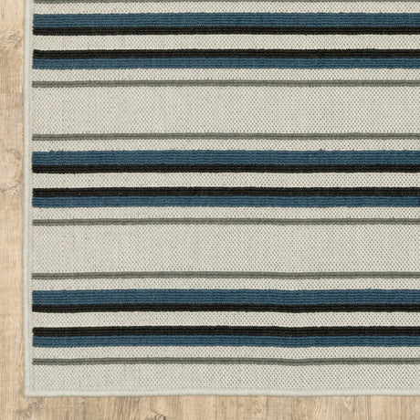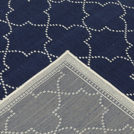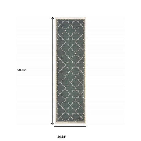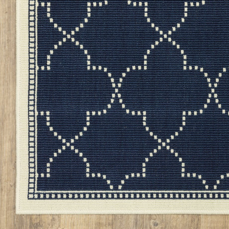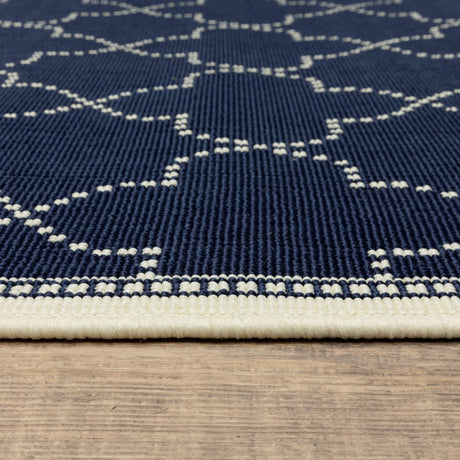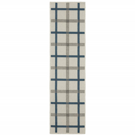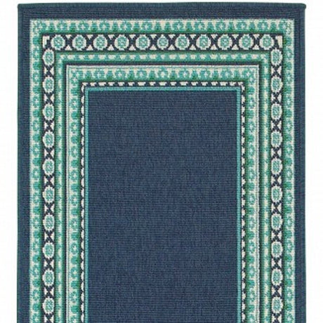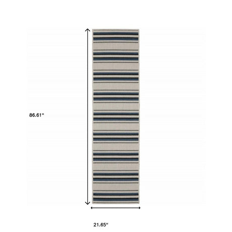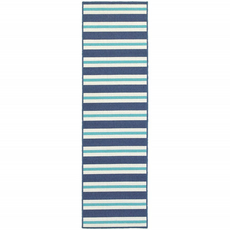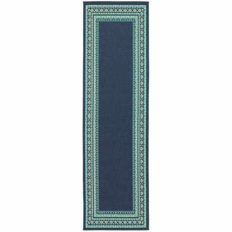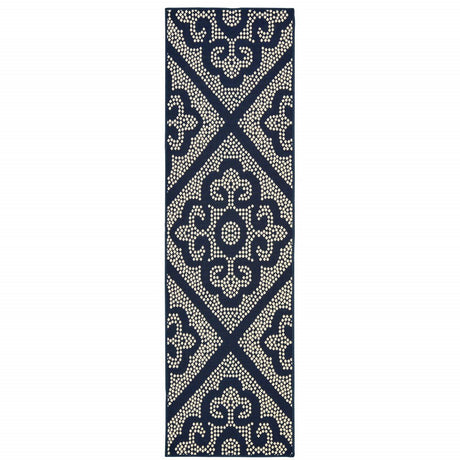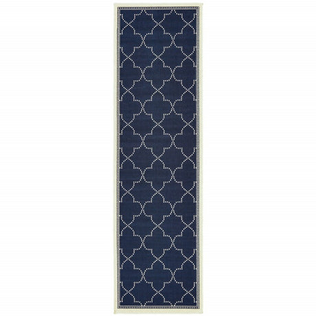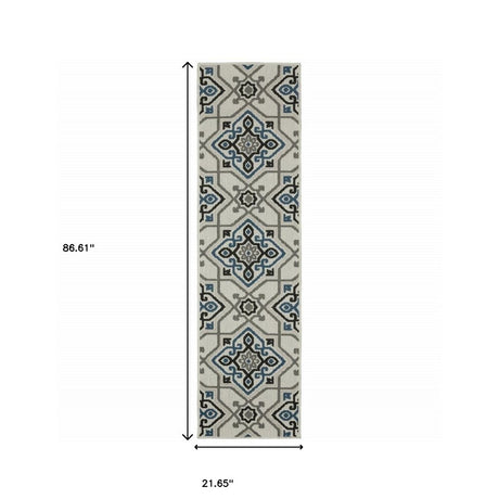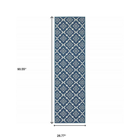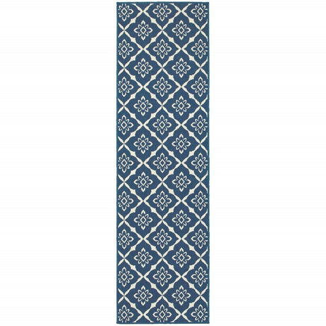 2' X 8' Blue and Ivory Geometric Stain Resistant Indoor Outdoor Area Rug
