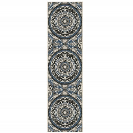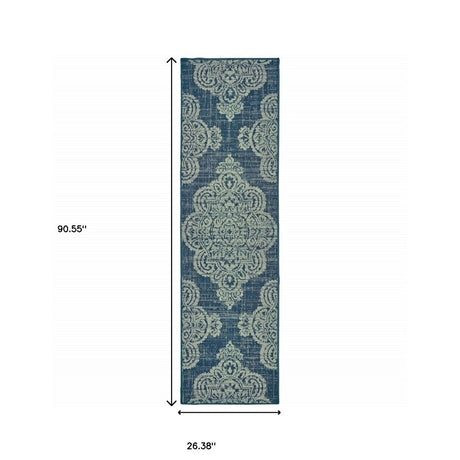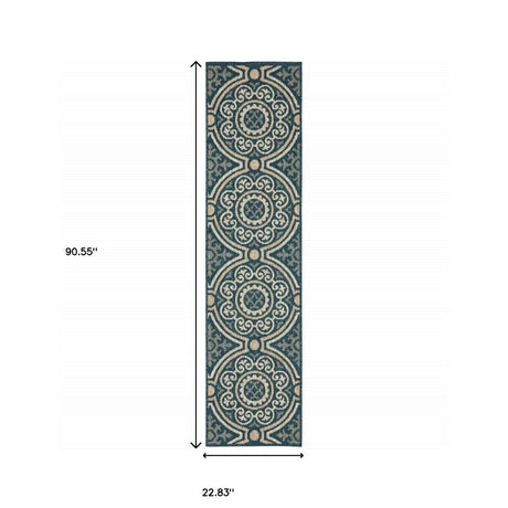 2' X 8' Blue and Beige Stain Resistant Indoor Outdoor Area Rug