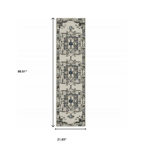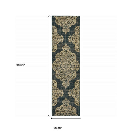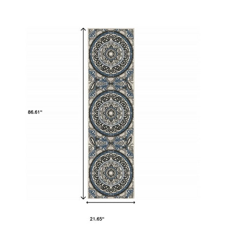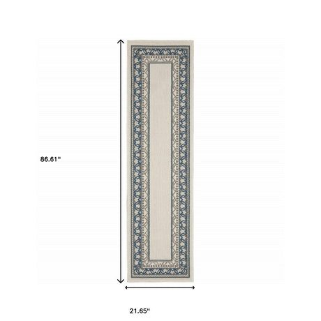 2' X 8' Blue and Beige Oriental Stain Resistant Indoor Outdoor Area Rug