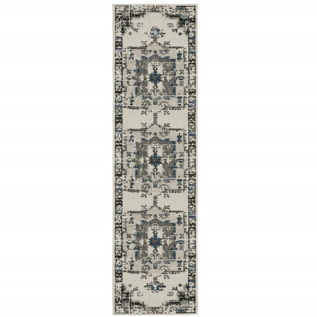 2' X 7' Gray and Ivory Oriental Stain Resistant Indoor Outdoor Area Rug