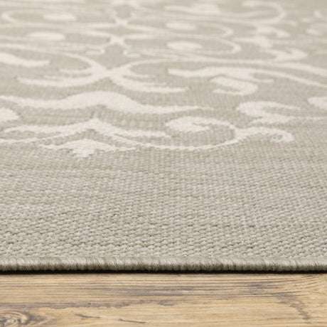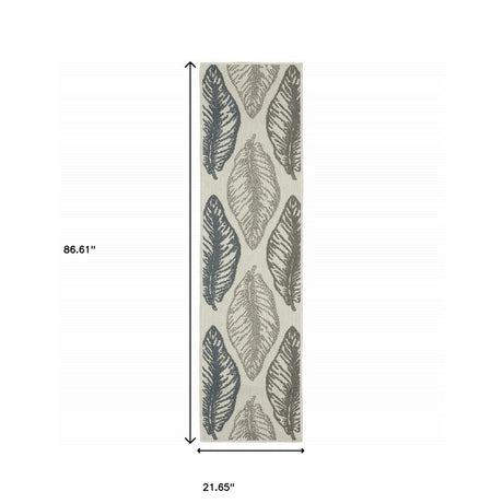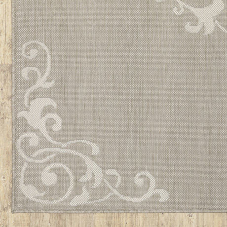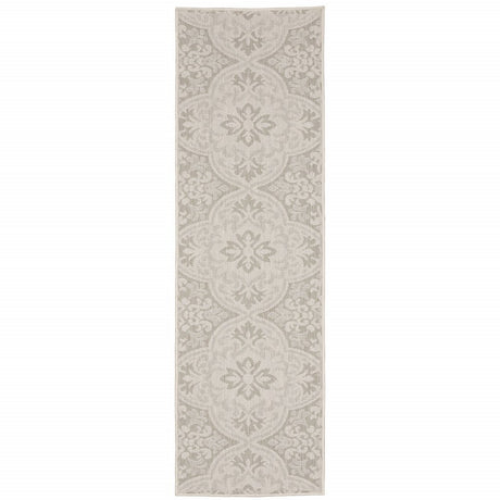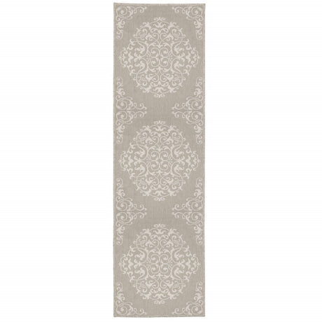 2' X 7' Gray and Ivory Floral Stain Resistant Indoor Outdoor Area Rug