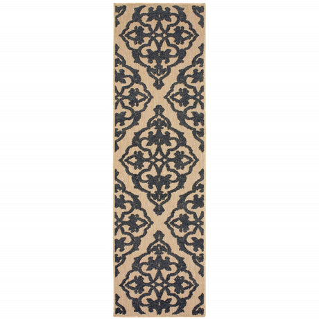 2' X 8' Beige and Black Oriental Stain Resistant Indoor Outdoor Area Rug
