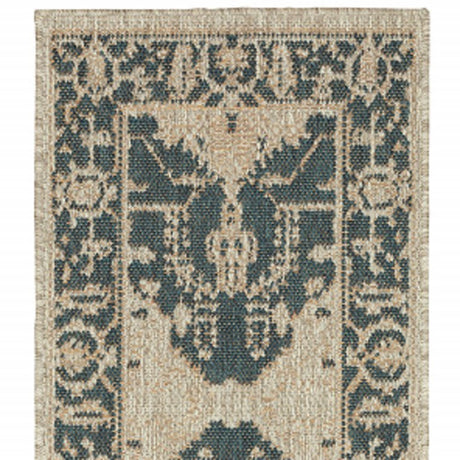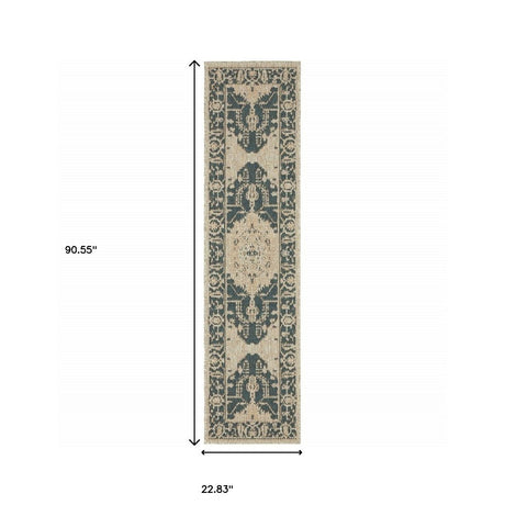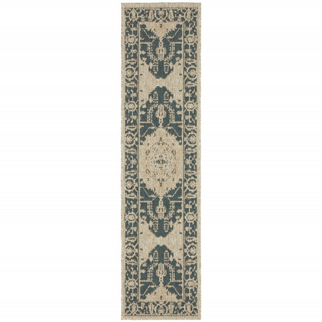 2' X 8' Ivory and Blue Oriental Stain Resistant Indoor Outdoor Area Rug