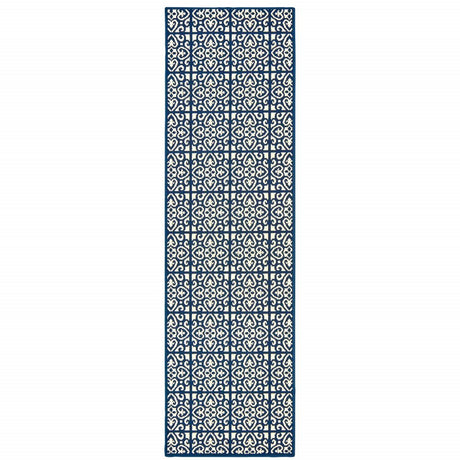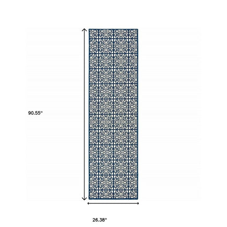 2' X 8' Ivory and Blue Geometric Stain Resistant Indoor Outdoor Area Rug