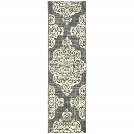 2' X 8' Gray and Ivory Oriental Stain Resistant Indoor Outdoor Area Rug